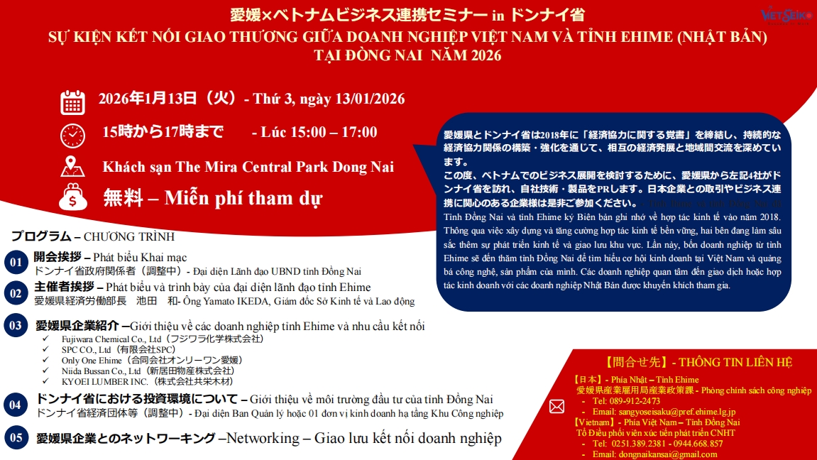 Sự kiện kết nối giao thương Việt Nhật ngày 13/01/2026 tại Đồng Nai. Cơ hội gặp gỡ 5 doanh nghiệp hàng đầu tỉnh Ehime trong lĩnh vực gỗ, dệt may, thực phẩm và mỹ phẩm.